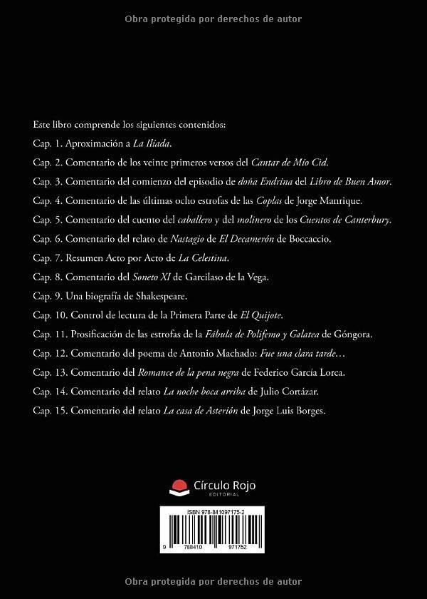 Este libro comprende los siguientes contenidos: Cap. 1. Aproximación a La Ilíada. Cap. 2. Comentario de los veinte primeros versos del Cantar de Mío Cid. Cap. 3. Comentario del comienzo del episodio de doña Endrina del Libro de Buen Amor. Cap. 4. Comentario de las últimas ocho estrofas de las Coplas de Jorge Manrique. Cap. 5. Comentario del cuento del caballero y del molinero de los Cuentos de Canterbury. Cap. 6. Comentario del relato de Nastagio de El Decamerón de Boccaccio. Cap. 7. Resumen Acto por Acto de La Celestina. Cap. 8. Comentario del Soneto XI de Garcilaso de la Vega. Cap. 9. Una biografía de Shakespeare. Cap. 10. Control de lectura de la Primera Parte de El Quijote. Cap. 11. Prosificación de las estrofas de la Fábula de Polifemo y Galatea de Góngora. Cap. 12. Comentario del poema de Antonio Machado: Fue una clara tarde… Cap. 13. Comentario del Romance de la pena negra de Federico García Lorca. Cap. 14. Comentario del relato La noche boca arriba de Julio Cortázar. Cap. 15. Comentario del relato La casa de Asterión de Jorge Luis Borges.